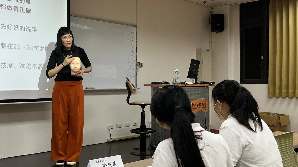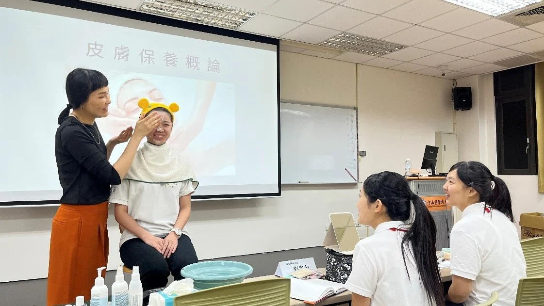 由校外聘請講師-陳頴嫺老師授課,教導皮膚保養的相關知識,將皮膚的基底保養好,以利後續上妝,留下好的門面印象。