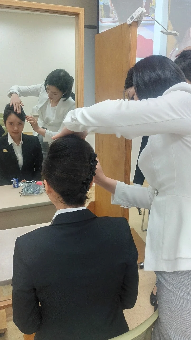 為了使同學們更深入掌握法國髻技巧並應用於正式場合,特別邀請 JSmanner_佳仕美人—陳葦庭老師前來授課。藉由老師的專業示範與逐一指導,讓每位團員皆能確實掌握法國髻要領,期望團員們能以更優雅且專業的形象投入各項活動接待與服務。