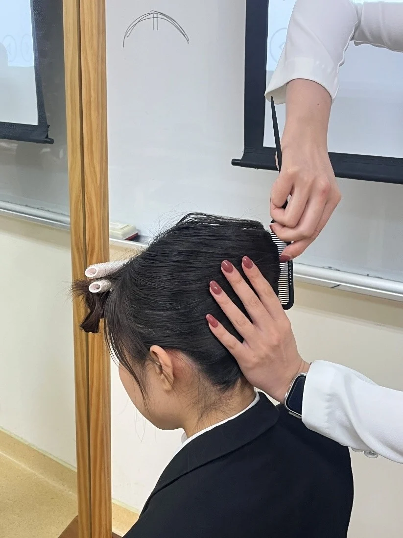 由校外指導老師講師團隊—陳葦庭老師教授法國髻課程,透過細緻講解與實作示範,針對不同髮型需求提供專業建議,使團員們能掌握優雅且實用的盤髮技巧,展現大方得體的形象與專業氣質。